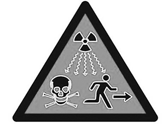 新标志为黑框红底三角,内有一个辐射波标记、一个骷髅头标记和一个逃跑的人形。